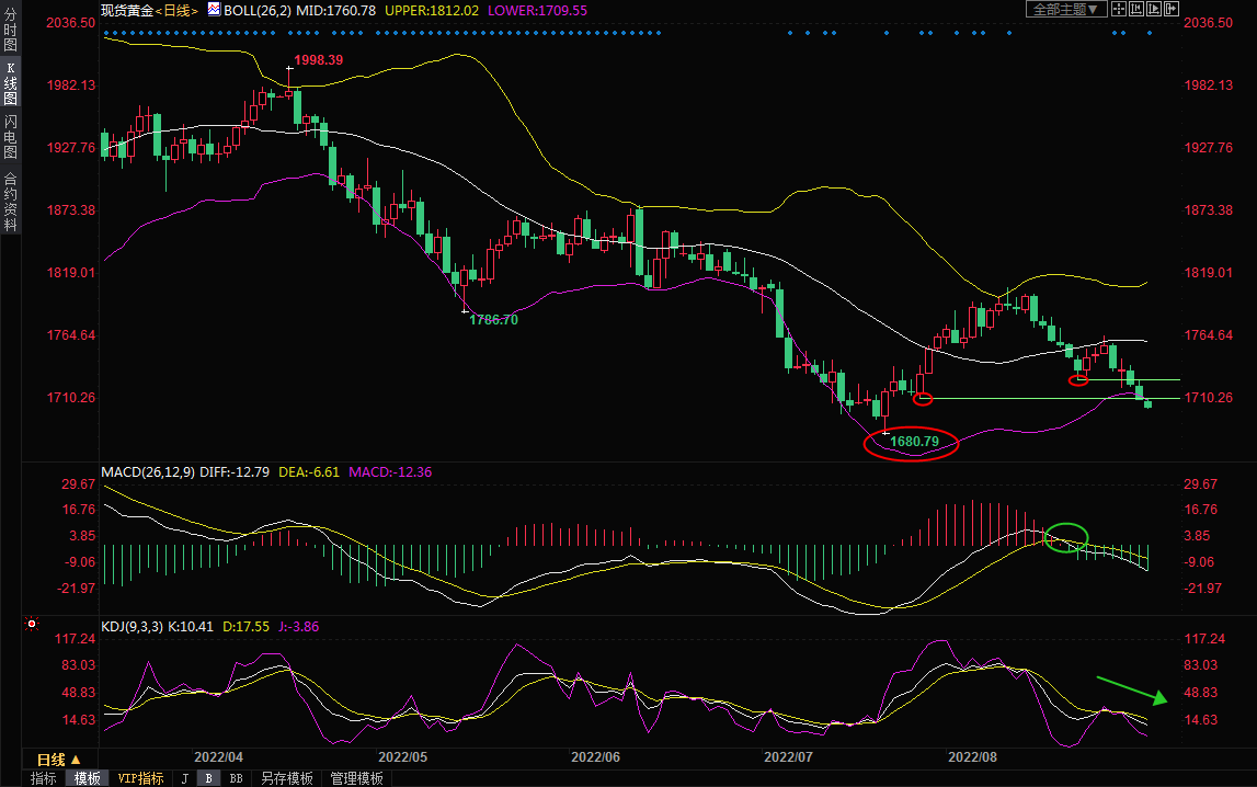 日线级别:震荡下跌;MACD死叉,KDJ向下发散,均线空头排列,布林线初步开口,空头占据明显上风,后市偏向沿布林线下轨向下运行,初步支撑在1700关口附近,然后是7月20日低点1692.35附近,强支撑在7月21日低点1680.79附近,2021年低点1676.91位置也可以参考,然后是2020年6月5日低点1670.98附近支撑。