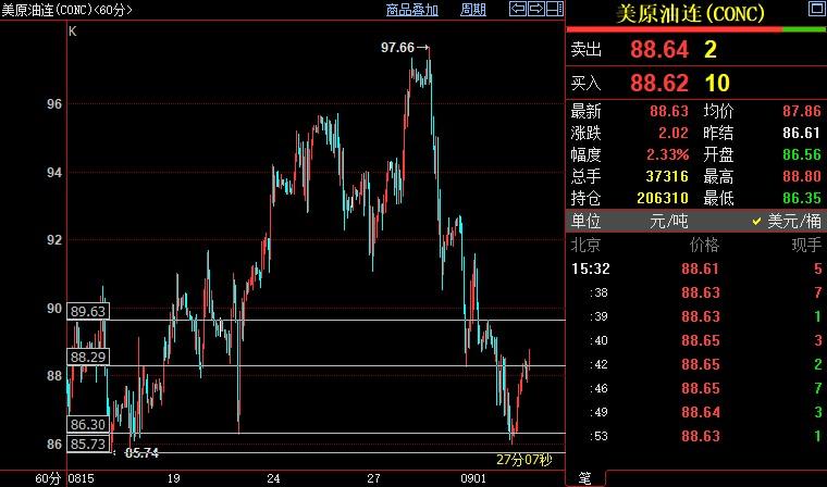 北京时间15:38,NYMEX原油期货上涨2.33%至88.63美元/桶;ICE布伦特原油期货上涨2.21%至94.40美元/桶。