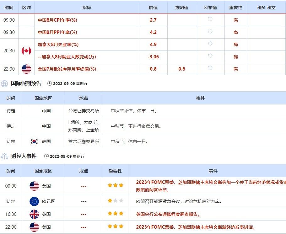 9月9日,中国台湾证券交易所中秋节补休,休市一日;上期所、大商所、郑商所、上金所因中秋节,不进行夜盘交易;韩国首尔证券交易所中秋节,休市一日。