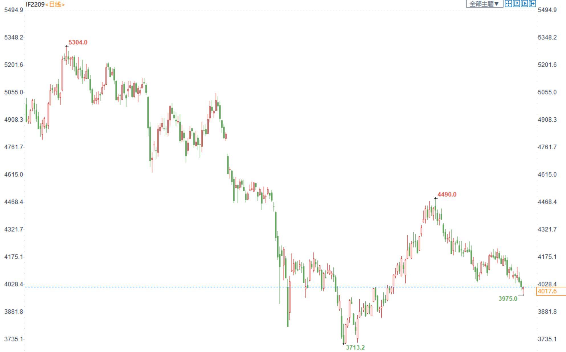 【今日行情】四大期指涨跌互现。IH2209收盘价为2702.8,收跌0.18%;IF2209收盘价为4017.6,收涨0.07%;IC2209收盘价为6158.4,收涨0.48%;IM2209收盘价为6747.2,收涨0.32%。今日市场震荡为主,尾盘出现小幅反弹,上证综指接近重回3200点。风格方面,以IC和IM为代表的中小盘略强于以IH为代表的大盘。板块方面,煤炭、石油板块重回强势,而食品饮料和医药板块延续7月初以来的回调走势。两市个股涨跌近乎各半,总成交额小幅增至7697.74亿元,连续第三个交易日为7000多亿元。两市量能处于低位,市场整体交投热情不佳。