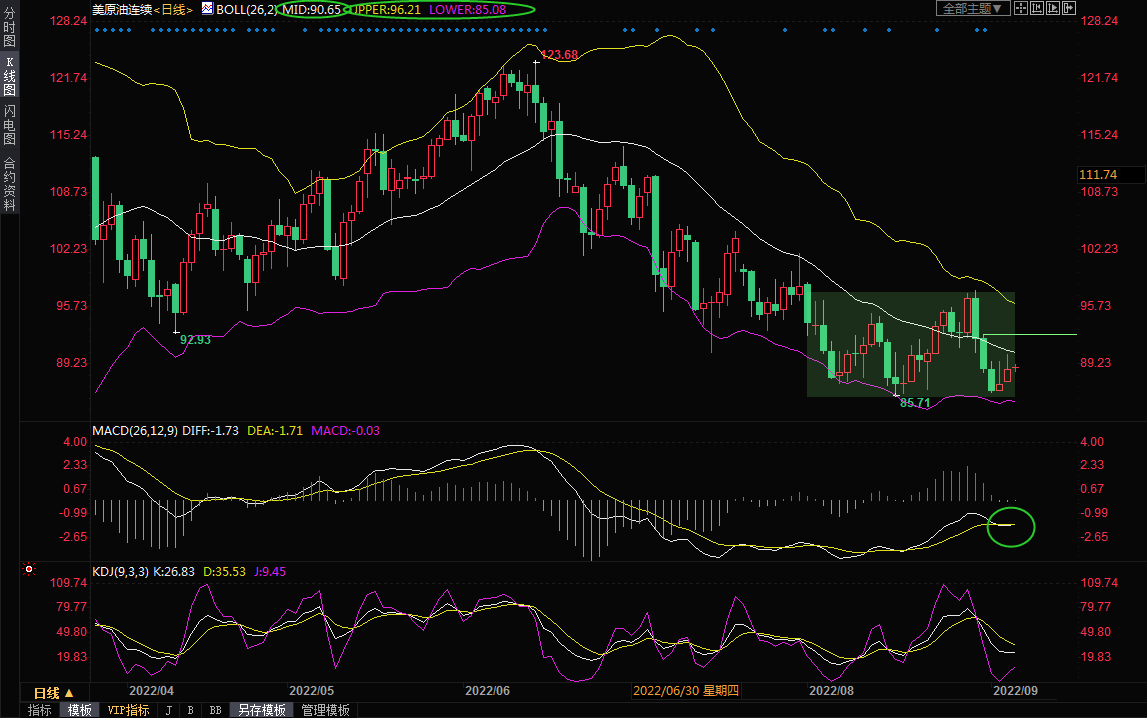 鉴于此前85.71和布林线下轨给油价提供支撑,短线关注布林线中轨90.64附近阻力,若能顶破该阻力,则后市有望进一步试探布林线上轨96.21附近阻力,55日均线和200日均线阻力目前都在该位置附近,若能进一步上破,则增加中线看涨信号。短线的话,8月31日高点92.71附近也还存在一定的阻力。