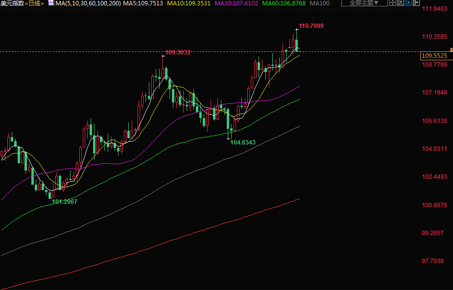 北京时间周四(9月8日)亚市早盘,美元指数交投于109.56附近;美元周三盘中再度刷新二十年高位至110.79,美联储官员表示,他们仍然不认为美国通胀最严重的时期已经过去,为美联储继续激进加息提供了条件;美元兑日元触及24年最高,兑英镑触及37年最高,日本坚持鸽派货币政策,欧洲面临经济问题,与相对较强劲的美国经济和鹰派的美联储形成鲜明对比,美元收盘有所回落,为黄金提供了一些喘息之机,金价反弹近1%;油价大跌6%,欧洲需求放缓和经济前景担忧加剧。