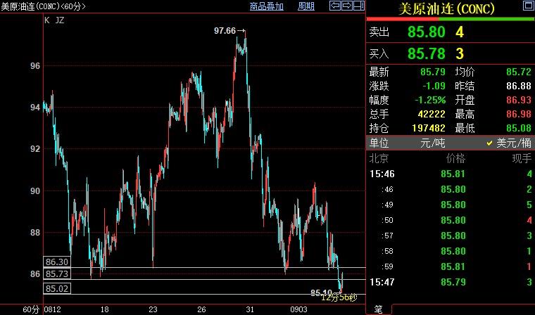 北京时间15:49,NYMEX原油期货下跌1.23%至85.85美元/桶;ICE布伦特原油期货下跌1.03%至91.87美元/桶。两市分别创1月26日以来新低至85.08美元/桶和2月18日以来新低至91.20美元/桶。