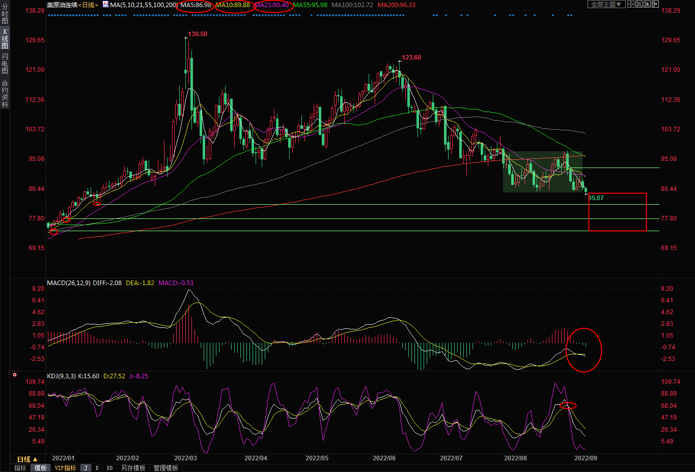 上方初步阻力在5日均线86.98附近,10日均线阻力在89.88附近,21日均线阻力在90.40附近,周一高点阻力也在该位置附近,若油价强势回升至该位置下方,则削弱后市看空信号。