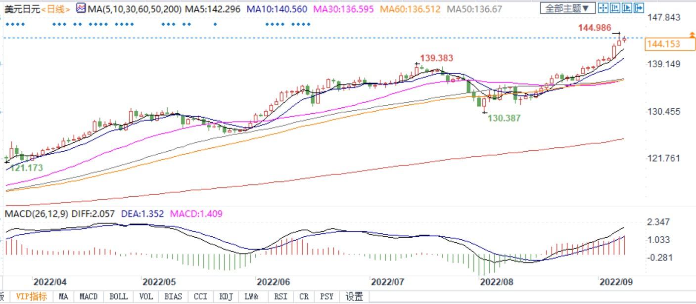 北京时间9月8日21:15,美元兑日元报144.36/37。