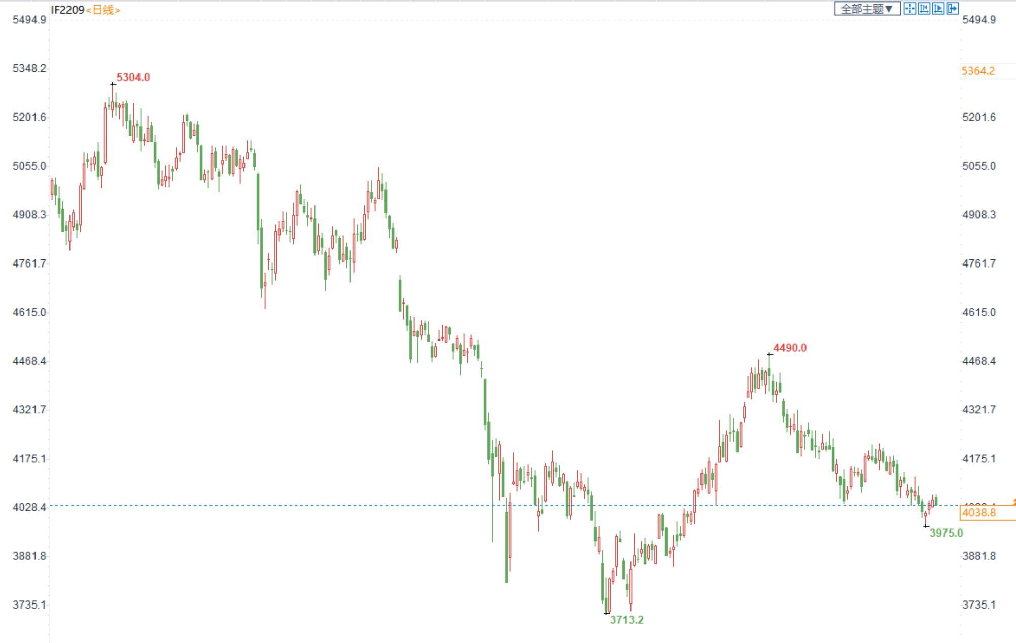 【今日行情】四大期指全线收跌。IH2209收盘价为2707.2,收跌0.18%;IF2209收盘价为4038.8,收跌0.34%;IC2209收盘价为6269.6,收跌0.28%;IM2209收盘价为6874.4,收跌0.63%。今日市场早盘震荡,午后加速走弱,上证综指连续第三日处于3200点上方。风格方面,宁德时代跌逾5%带弱新能源板块,美债收益率突破3.3%也对“新半军”估值形成一定压制,IM和IC表现偏弱于IH,但在国内充裕的流动性支撑下,短期市场风格难以转向。板块方面,国防军工依旧强势,涨幅居前,新能源、电子以及石化板块出现回调,均跌逾1%。两市跌多涨少,超3600只个股收跌,总成交额降至7883.67亿元。