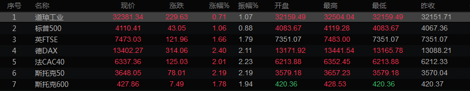 美股收盘情况:道琼斯工业指数上涨0.71%,至32381.34点;标普500指数上涨1.06%,至4110.41点;纳斯达克指数涨1.27%,至12266.41。