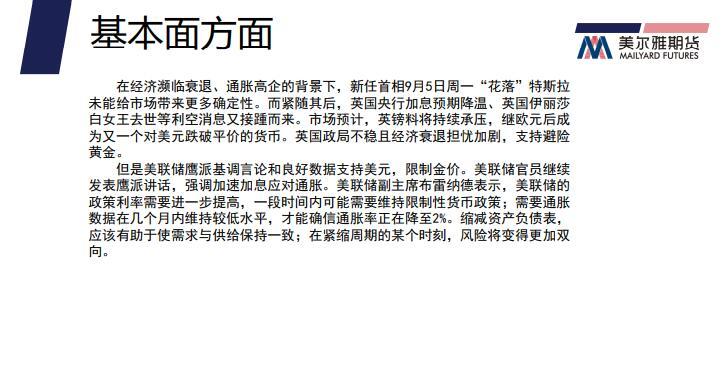 在经济濒临衰退、通胀高企的背景下,新任首相9月5日周一“花落”特斯拉未能给市场带来更多确定性。而紧随其后,英国央行加息预期降温、英国伊丽莎白女王去世等利空消息又接踵而来。市场预计,英镑料将持续承压,继欧元后成为又一个对美元跌破平价的货币。英国政局不稳且经济衰退担忧加剧,支持避险黄金。