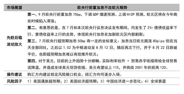 第三,7 月欧央行超预期加息 50bp 有一定的坐标意义:加息当日欧元跳涨 80pips 但在当天全部回吐,之后以 1.02 为中枢波动至 8 月 12 日,随后再次下行,并于 8 月 22 日跌破平价,也即超预期加息难以有效推升欧元;