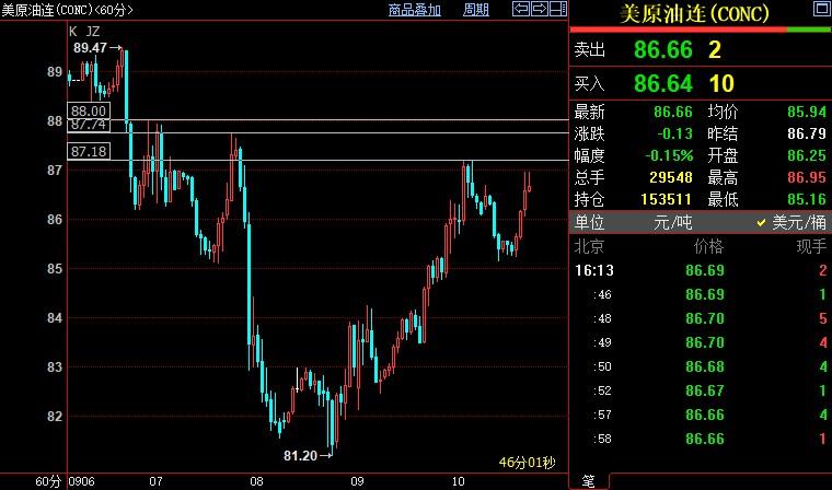 北京时间16:17,NYMEX原油期货下跌0.03%至86.76美元/桶;ICE布伦特原油期货上涨0.15%至92.95美元/桶。