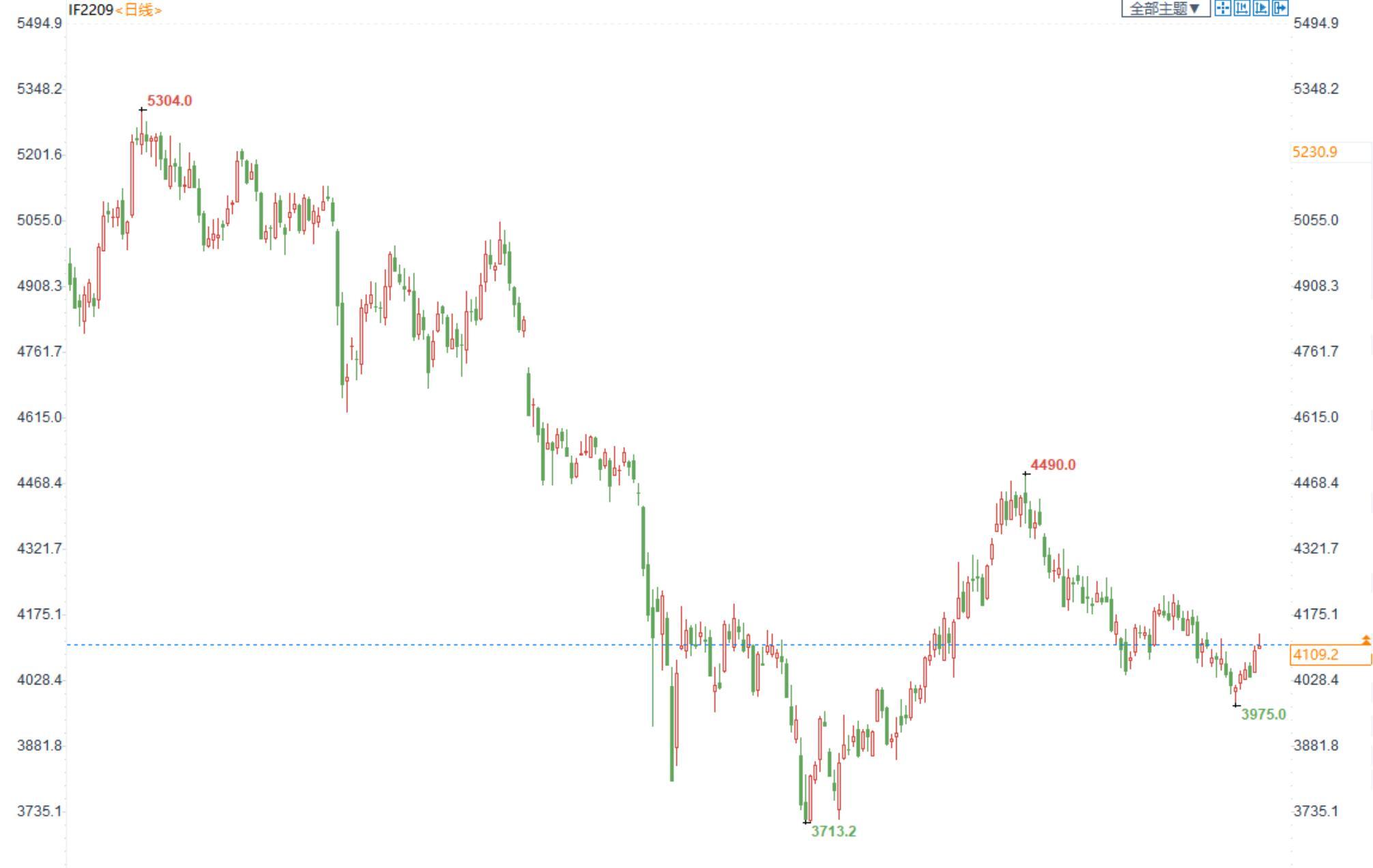 【今日行情】四大期指涨跌互现。IH2209收盘价为2767.4,收涨0.12%;IF2209收盘价为4109.2,收涨0.23%;IC2209收盘价为6292.6,收跌0.42%;IM2209收盘价为6891.4,收跌0.27%。今日市场早盘震荡,午后加速走弱,上证综指接近3300点,短期难改3200-3300点之间的箱体震荡。风格方面,美债收益率突破3.3%对成长板块估值形成一定压制,IM和IC表现偏弱于IH。板块方面,国防军工依旧强势,涨幅居前,地产、煤炭均跌逾1%。两市涨跌近乎各半,总成交额降至7714.38亿元。