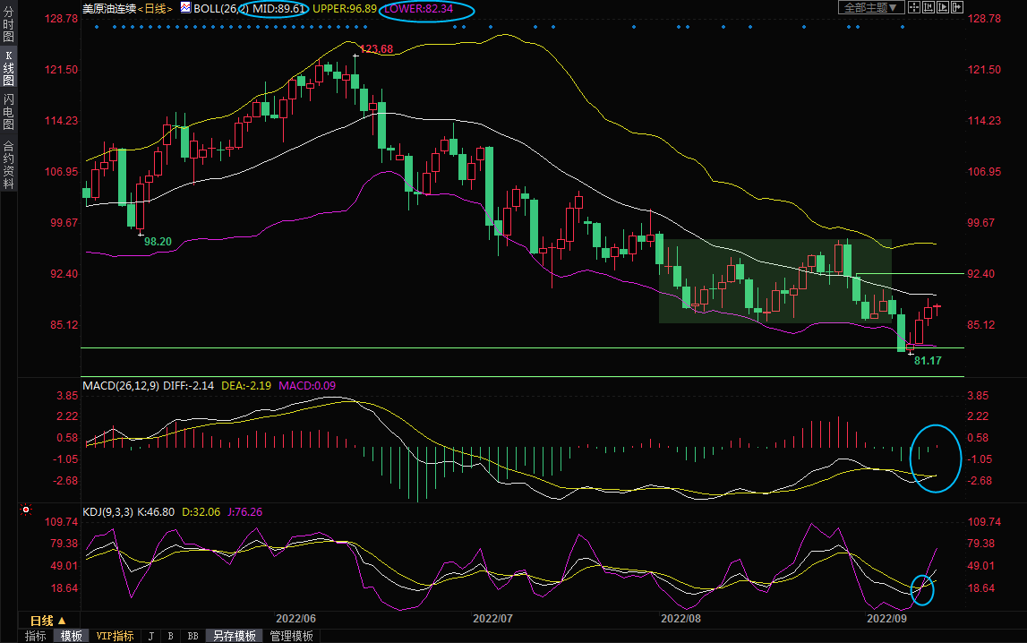 下方初步支撑在10日均线86.47附近,5日均线支撑在85.35附近,若回落至该位置下方,则削弱短线看涨信号;9月8日高点84.23附近也存在一些支撑,强支撑在布林线下轨82.34附近。