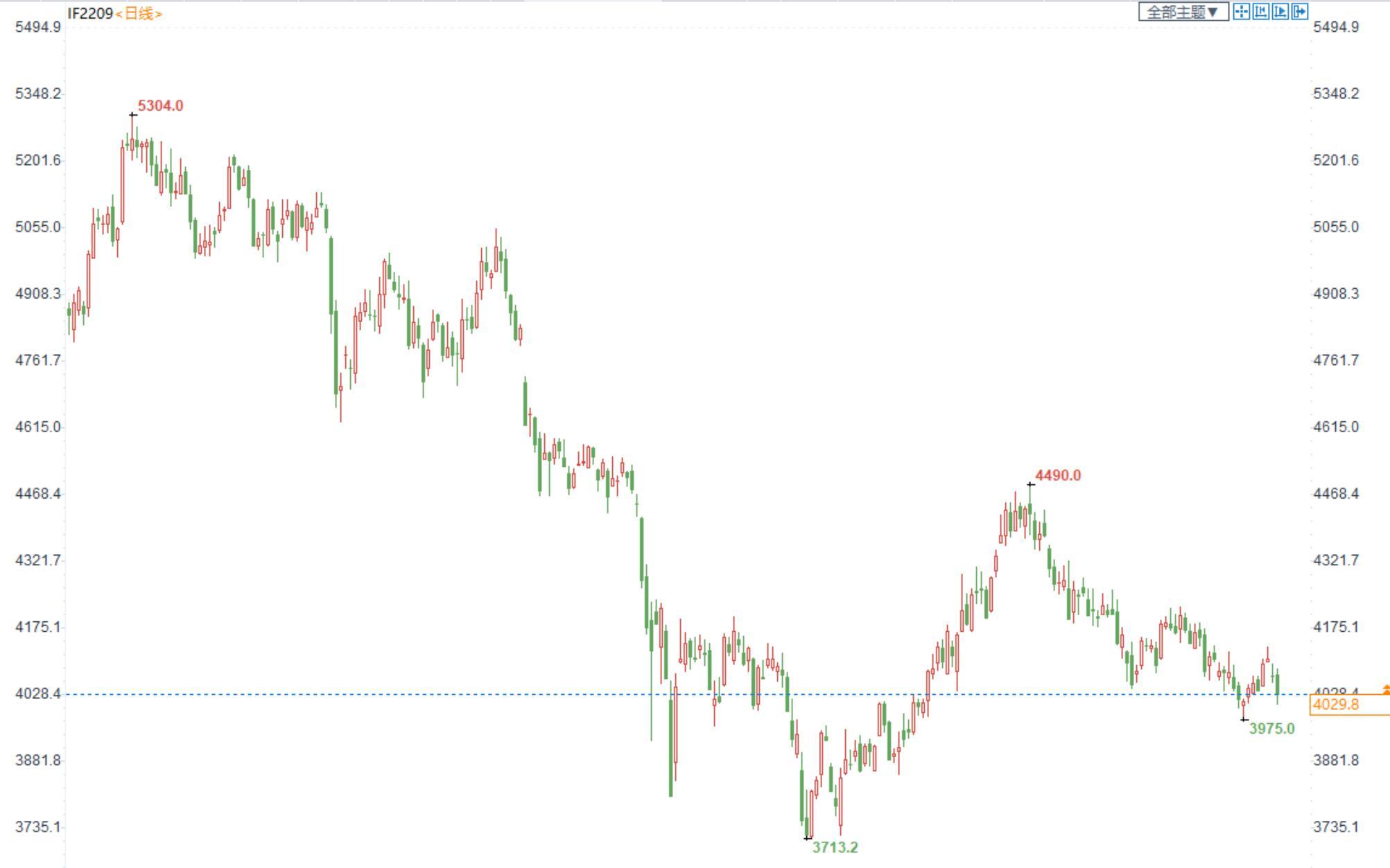 【今日行情】四大期指全线收跌。IH2209收盘价为2746.4,收跌0.16%;IF2209收盘价为4029.8,收跌0.98%;IC2209收盘价为6100.6,收跌2.48%;IM2209收盘价为6596.4,收跌3.31%。美国8月CPI同比不及预期使得市场对于美联储下周激进加息预期进一步升温,十年期美债收益率走强至3.4%上方,对成长赛道板块估值造成较强压制,与此同时,今日央行缩量续作到期的MLF,使得市场对于未来央行政策产生一定担忧,双重利空使得今日市场全天弱势,上证综指跌穿3200点。风格方面,美债收益率突破3.4%对成长板块估值形成一定压制,IM和IC表现偏弱于IH。板块方面,新能源、汽车以及电子板块大跌,房地产、银行成为为数较少的上涨板块。两市放量下跌,逾4100只个股收跌,总成交额增至9192.99亿元。
