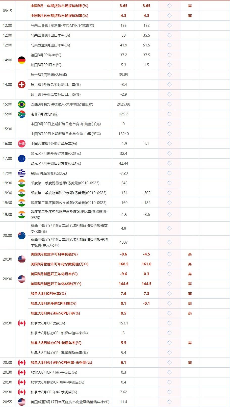 09:15 中国9月五年期贷款市场报价利率(%) , 前值 4.3 , 预期值 4.3 , 公布值:待发布