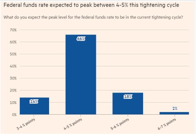 多数受调查经济学家预计美联储联邦基金利率峰值在4%-5%区间