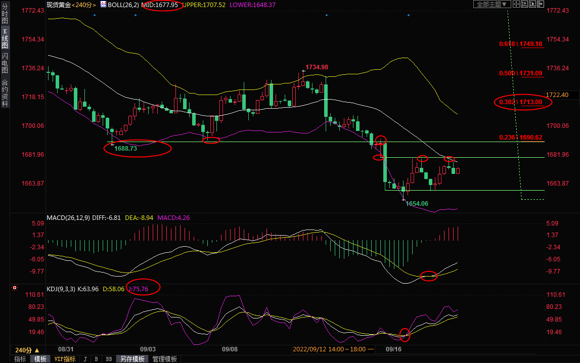 由于KDJ金叉,MACD金叉,若金价能够顶破1680关口附近阻力,则增加短线看涨信号,进一步阻力在1807-1654跌势的23.6%回撤位1690.62附近,然后是1700整数关口和38.2%回撤位1713.10附近阻力。