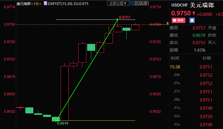 北京时间周四(9月22日)15:30,瑞士央行公布新政,如期加息75个基点,但瑞士央行下调经济增速预测。截至发稿,美元兑瑞郎跳升138点至0.9757。