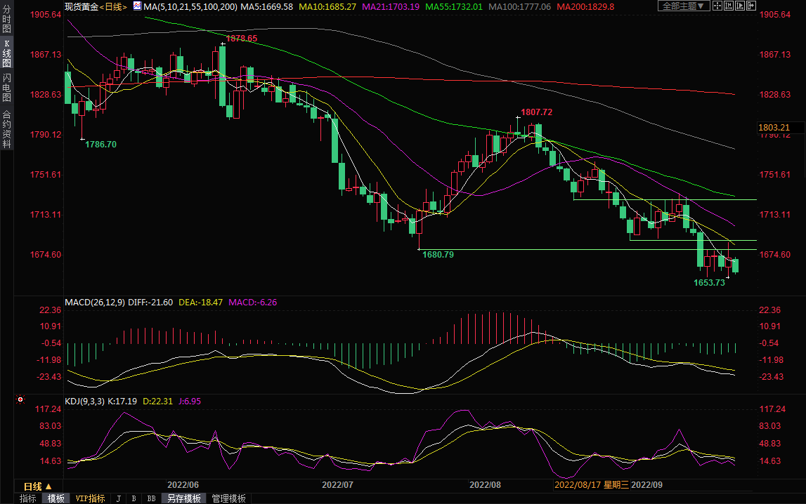 日线级别:震荡下跌;7月21日低点1680和9月1日低点1688.71附近阻力仍对金价压制明显,MACD死叉信号延续,KDJ死叉信号延续,短线金价仍有进一步下探风险,初步支撑在隔夜低点1653.73附近,进一步支撑在2020年3月26日高点1645.02美元/盎司附近,4月8日低点支撑在1640.90附近,该位置支撑相对较强,需要重点关注;如果进一步下破,则金价后市可能会跌向1600关口附近。
