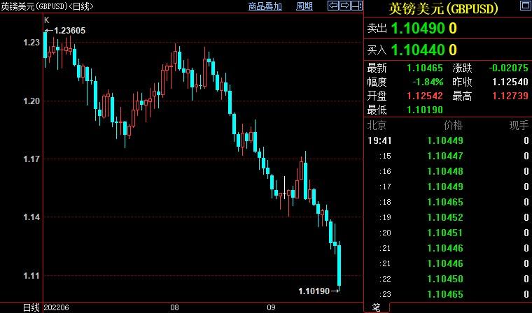 英镑兑美元大跌2.96%至1.1087,盘中创上世纪80年代中期以来新低至1.1073。英国央行如期加息50个基点,但9名委员中3人支持加息75个基点,另有1人支持仅加息25个基点。投票分歧无助于让市场相信,英国央行决心大力收紧政策。