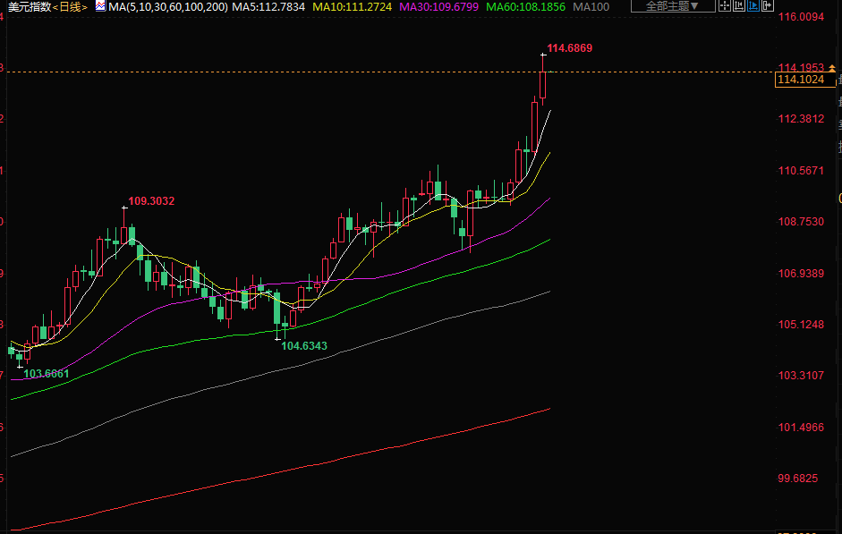 北京时间周二(9月27日)亚市早盘,美元指数交投于114.12附近;美元周一再度刷新二十年高位至114.68,受益于英镑骤降超500镑和欧元创下二十年新低的帮助,投资者担心英国的新经济计划将损害该国财政状况,金价徘徊在两年半低位附近;油价收于九个月最低,受累于美元走强,市场参与者在等待对俄罗斯新制裁的细节。