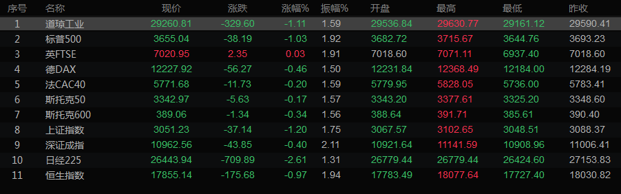 美股收盘情况:道琼斯工业指数下跌1.11%,收于29260.81点;标普500指数下跌1.03%,至3655.04点;纳斯达克指数下跌0.6%,至10802.92点。