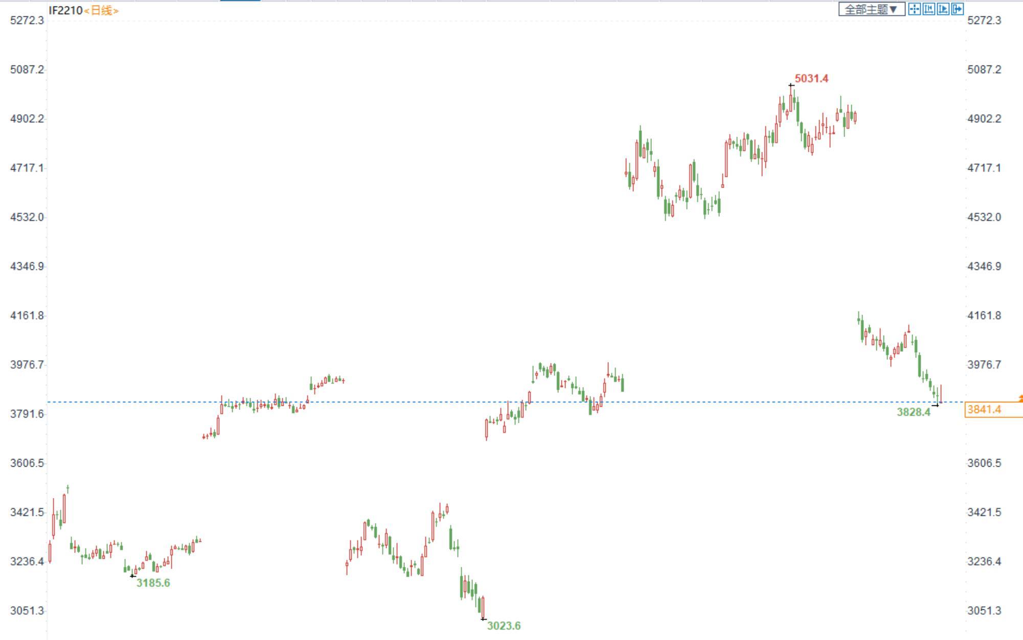 【今日行情】四大期指全线收跌。IH2210收盘价为2615,收跌0.74%;IF2210收盘价为3841.4,收跌0.63%;IC2210收盘价为5804.4,收跌1.34%;IM2210收盘价为6255,收跌1.24%。今日市场早盘冲高,午后加速走弱,延续前期弱势。板块方面,石油石化以及煤炭板块跌幅居前,长假临近消费者服务板块涨逾3%。市场总成交额缩至6681.66亿元,连续第6个交易日处于6000亿元上方,量能极致萎缩。