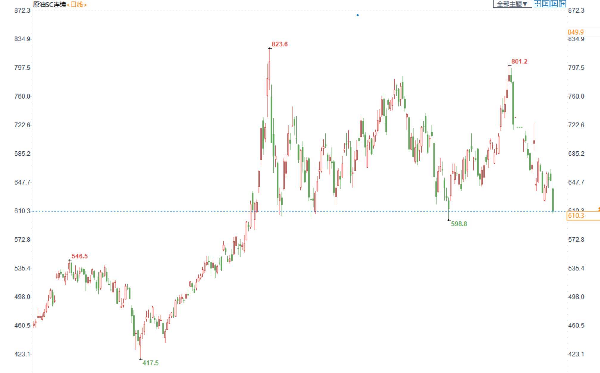期货市场,布油在85美元附近震荡整理,国内SC2211合约大幅收跌,收盘价610.3。