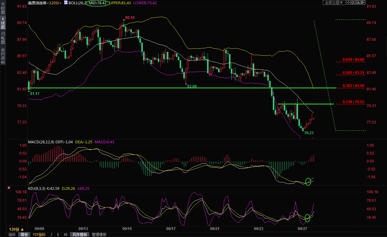 2小时级别:震荡下跌后反弹;MACD金叉,KDJ金叉,短线略微偏向多头,关注布林线中轨78.45附近阻力,若能顶破该阻力,则有望进一步试探80整数关口附近阻力,强阻力在90.16-76.23跌势的38.2%回撤位81.56附近,若能强势回升至该位置上方,则增加短线见顶信号。
