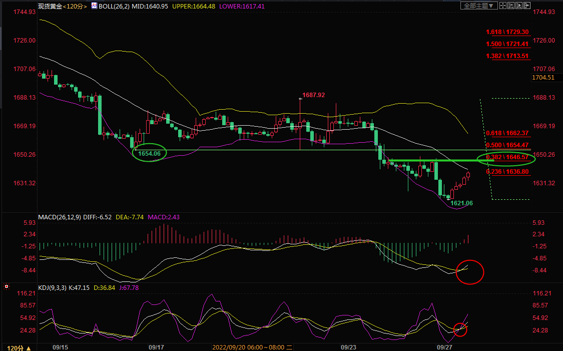2小时级别:震荡下跌后反弹;MACD金叉,KDJ金叉,相对低位出现“吞没”看涨,金价短线偏向多头,初步阻力在布林线中轨1640.89附近,进一步阻力在1687-1621的跌势的38.2%回撤位1646.57附近,强阻力在1654.06一线,50%回撤位阻力也在该位置附近,若能收复该位置,则增加短线看涨信号。
