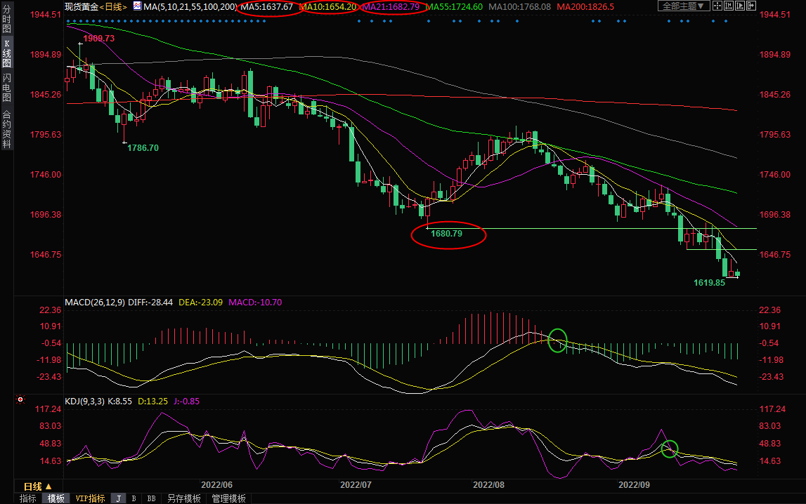 上方初步阻力在5日均线1637.50附近,10日均线和9月16日低点阻力在1654.10附近,若金价探底后回升至该位置上方,则削弱后短线看空信号;强阻力在7月21日低点1680.71附近,21日均线也在该位置附近,若能强势收复该位置,则削弱中线看空信号。