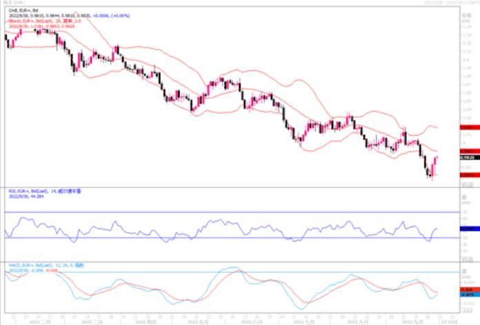 近几个交易日里,由于美元自历史高位有所回落,欧元周四继续录得反弹性上升0.7%,兑美元回到0.98楼上。数据显示,欧元区9月份经济景气度大幅下降,且降幅超过预期,因为企业和消费者信心下降,他们对未来几个月的通胀趋势也持悲观态度。然而,最大的焦点是德国的通胀率,本月跃升至10.9%,远远超出预期的10%。这表明周五将公布的更广泛的欧元区19国的数字也可能超过预测的9.6%,这加强了在下一次欧洲央行政策会议上再加息75个基点的理由。尽管如此,一些分析人士认为,欧洲央行的潜在行动很可能只是对欧元的短期提振。由于欧元区经济衰退预期高企,加息幅度也难以超过美国,因此欧央行即便随后又加息行为,恐怕对于欧元的刺激作用也是微乎其微。日图在0.9550一线企稳收录早晨之星,随机指标倾向自超卖区域回升,但上方0.99处压力仍沉重。4小时图短暂下探前期下影线低点0.9552后企稳,并以大阳线拉升,RSI、MACD等技术指标上扬,显示一定的反弹动能,三上方0.99压力线若不能突破,则短线回调须关注0.9670支持。该支撑位若跌破,将宣告此轮反弹失败。