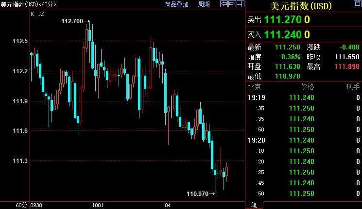 北京时间19:19,现货黄金上涨0.20%至1702.96美元/盎司;COMEX期金主力合约上涨0.58%至1711.8美元/盎司;美元指数下跌0.35%至111.246。