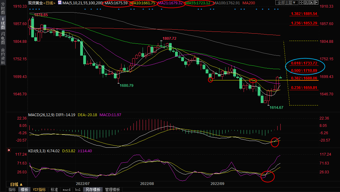 日线级别:单边下跌后反弹;MACD金叉,KDJ金叉,5日均线上穿10日均线结成金叉,金价顶破了21日均线和1680关口的双重阻力,也初步顶破了9月21日高点和9月1日低点1688.71附近的双重阻力位,目前该位置已经转化为初步支撑所在,在失守该位置前,金价后市偏向延续反弹走势,进一步阻力参考1807-1614跌势的50%回撤位1710.89附近阻力,关键阻力在55日均线1723.13附近,61.8%回撤位阻力在1733.72附近。
