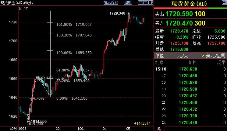 北京时间19:24,现货黄金下跌0.94%至1709.81美元/盎司;COMEX期金主力合约下跌0.70%至1718.4美元/盎司;美元指数上涨0.63%至110.873。