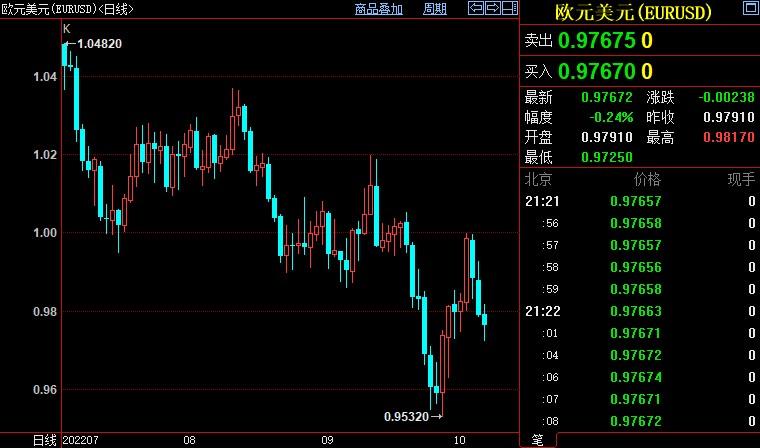 欧元兑美元下跌0.48%至0.9751,盘中一度逼近1.00平价。欧洲央行9月会议的报告显示,决策者似乎越来越担心高通胀可能会变得根深蒂固,因此即使以增长疲软为代价,也有必要采取激进的政策收紧政策,这是主要央行对抗通胀远未结束的另一个迹象。