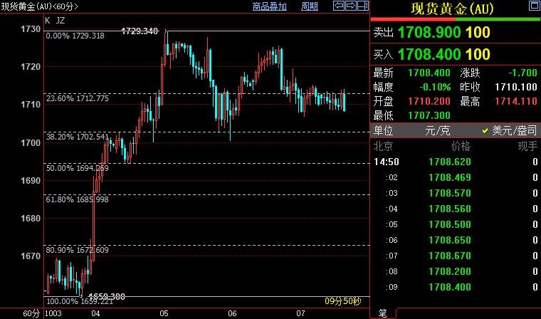 北京时间14:57,现货黄金下跌0.21%至1709.09美元/盎司;COMEX期金主力合约下跌0.23%至1716.8美元/盎司;美元指数上涨0.12%至112.391。