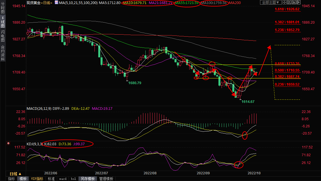 日线级别:类似V型反弹;MACD金叉,KDJ金叉,5日均线上穿10日均线和21日,后市偏向多头,短线留意55日均线1723.63附近阻力,若能顶破该阻力,则有望打开新的上涨空间,中线有望看向1800关口附近。短线的话,1807-1614跌势的61.8%回撤位1733.35附近,8月29日高点1745.39附近也还分别存在一定的阻力,100日均线1759.56附近也存在较强的阻力。