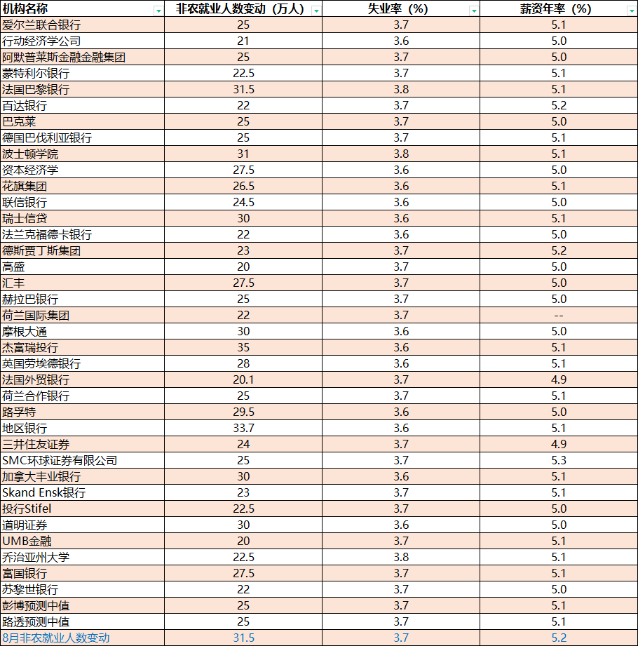 38家投行预测9月非农:失业率料持平但新增就业料放缓!金价有望震荡上攻