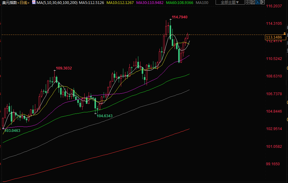 纽约尾盘,美元指数上涨0.3%,报113.14,脱离了上周触及的110左右的低点,并向上月触及的20年高点114.78爬升。欧元兑美元下跌0.4%,报0.9705美元。
