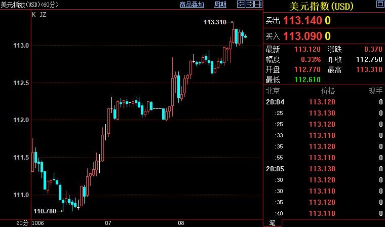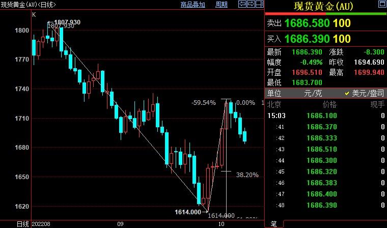 北京时间20:05,现货黄金下跌1.08%至1676.83美元/盎司;COMEX期金主力合约下跌1.47%至1684.1美元/盎司;美元指数上涨0.31%至113.121。