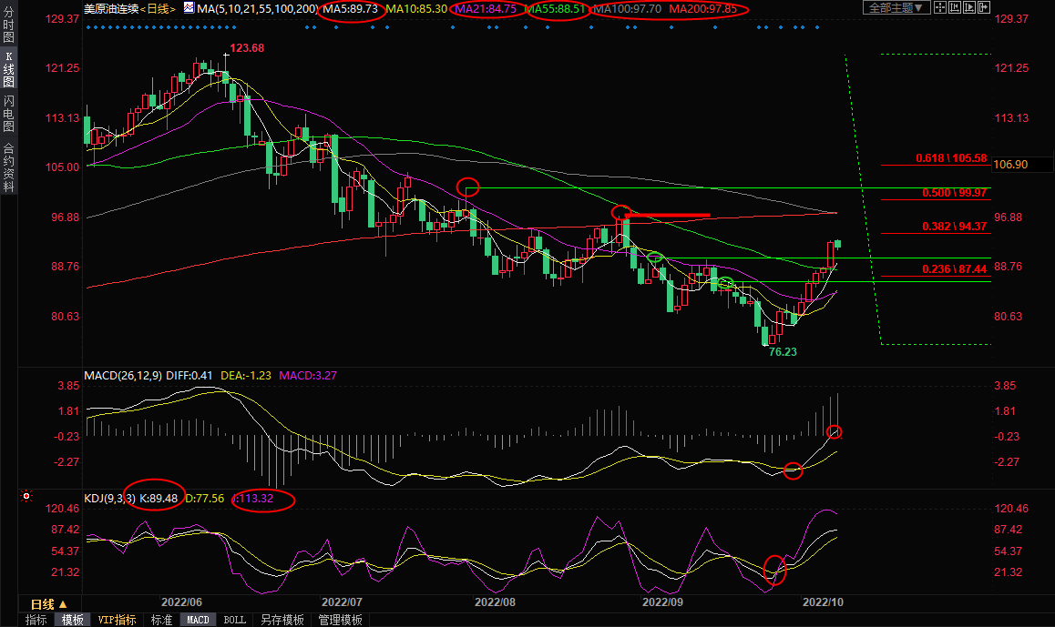 由于目前油价还受到123.68-76.23跌势的38.2%回撤位94.37阻力压制,KDJ的K值和J值也发出了短线超买信号,短线回调风险也比较大,90.36已经转化为初步支撑所在,5日均线支撑在89.73附近,55日均线支撑在88.51附近,9月16日高点支撑在86.57附近,若意外回落至该位置下方,则削弱后市看涨信号。