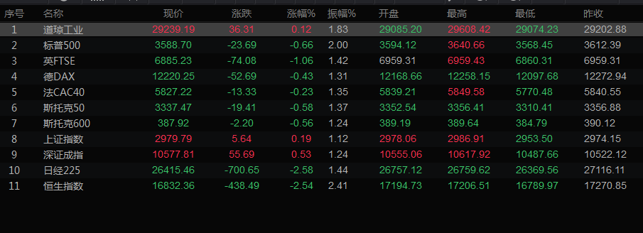 美股收盘情况:道琼斯工业指数涨0.12%,至29239.32点;标普500指数下跌0.65%,至3588.74点;纳斯达克指数下跌1.1%,至10426.19点。
