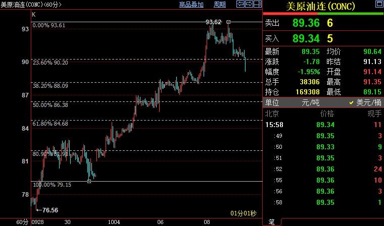 北京时间16:00,NYMEX原油期货下跌1.89%至89.44美元/桶;ICE布伦特原油期货下跌1.67%至94.60美元/桶。
