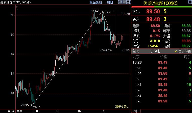 北京时间16:21,NYMEX原油期货上浮0.18%至89.51美元/桶;ICE布伦特原油期货上浮0.33%至94.61美元/桶。