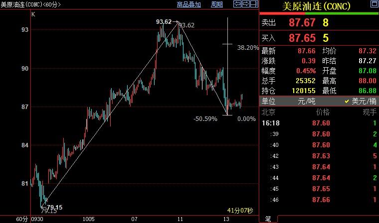北京时间16:25,NYMEX原油期货上浮0.47%至87.68美元/桶;ICE布伦特原油期货上涨0.64%至93.03美元/桶。