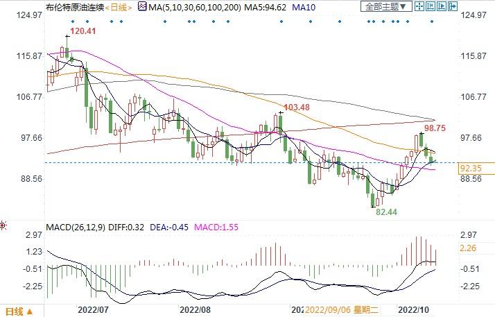 北京时间10月13日14:51,布伦特原油连续报92.35美元/桶