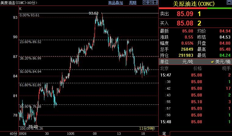 北京时间15:52,NYMEX原油期货上涨0.37%至85.92美元/桶;ICE布伦特原油期货上涨0.47%至92.05美元/桶。