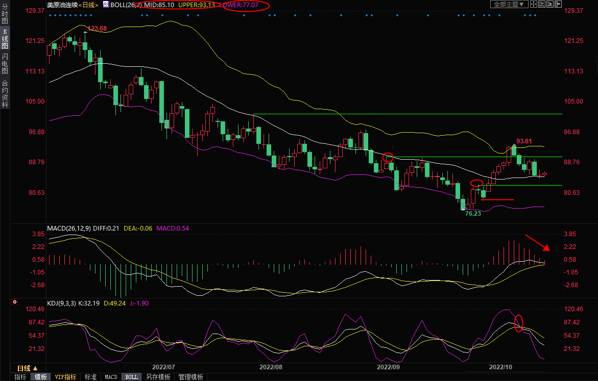 另外,55日均线需要重点关注,如果油价持续受到该阻力压制,并回落至布林线中轨85.10下方,则增加短线下行风险;进一步支撑参考9月29日高点82.92附近,9月30日低点支撑在79.12附近,布林线下轨支撑在77.07附近。