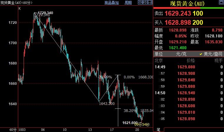北京时间14:54,现货黄金上浮0.02%至1629.48美元/盎司;COMEX期金主力合约下沉0.01%至1634.0美元/盎司;美元指数下跌0.10%至112.792。