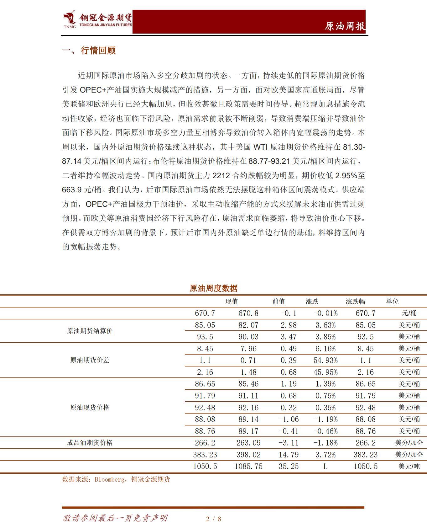上周国际油价总体呈先抑后扬趋势。主要的影响还是因为OPEC实施大规模减产措施托底,以及美国对OPEC的施压。此外,俄乌冲突长期化的概率进一步提升,俄乌冲突的再升级从中长期来看对欧洲乃至全球经济的不利影响加大,海外市场需求端的下行压力依旧较大。另一方面,之前市场计价了伊原油回归的预期,因此油价还有不确定性。而目前伊朗是否回归还存在大量的拉扯,市场开始观望伊朗的回归情况,而且欧佩克的减产举动让市场预期,即使伊朗回归,那么欧佩克也会再度出手维护油价。因为市场不再那么担忧伊朗原油回归后的价格重挫,因此油价逐步走高。后续还需要观察美国对欧克施压的效果,尤其是美国已经提案,准备对欧佩克反垄断。总体来看,欧美央行都在通胀的影响下进入了加息通道,加息或在中长期引起经济衰退,经济衰退又会引起需求不足的担忧,并且后续伊朗随时可能回归市场,以及中国疫情的变化也可能削弱需求,原油价格或小幅震荡,还需要关注供应变化和情绪转向的风险。